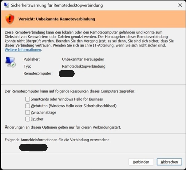 Wenn eine RDP-Datei nicht digital signiert ist, gibt es keine Möglichkeit, zu überprüfen, wer sie erstellt hat oder ob sie manipuliert wurde. In diesem Fall zeigt das Sicherheitsdialogfeld ein Banner mit dem Titel Vorsicht: Unbekannte Remoteverbindung und legt das Feld Publisher auf “Unbekannter Herausgeber” fest.