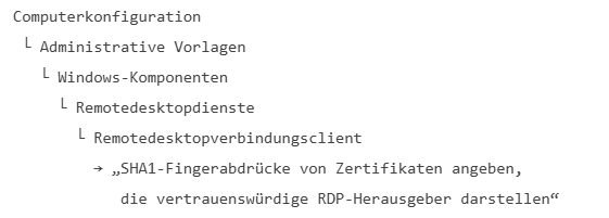 Die Signatur der RDP-Datei erfolgt mit Hilfe eines Tools von Microsoft namens RDPSIGN. Die Funktionsweise bzw. der Ablauf wird in diesem Artikel von Microsoft beschrieben: https://learn.microsoft.com/de-de/windows-server/administration/windows-commands/rdpsign