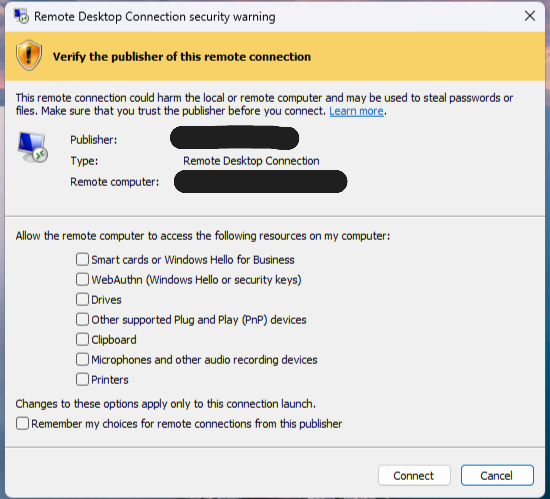 Wenn Sie eine RDP-Datei öffnen, kann sie den Zugriff auf Ressourcen auf Ihrem lokalen Gerät anfordern. Diese Anforderungen werden als Umleitungen bezeichnet. Sie teilen Teile Ihres lokalen Geräts mit dem Remotecomputer. Nach diesem Update werden alle von RDP-Dateien angeforderten Umleitungen standardmäßig deaktiviert , es sei denn, Sie entscheiden sich dafür.